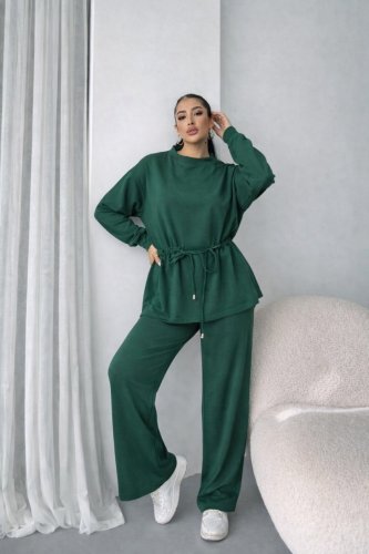 Kadın uzun kollu bisiklet yaka belden büzgülü bağcıklı viskon iki iplik bluz ve pantolon ikili takım