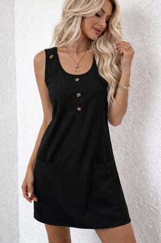 • Kadın askılı yuvarlak yakalı önden düğmeli cep detaylı kısa elbise