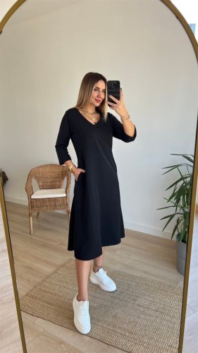 Kadın uzun kollu v yakalı yanlardan yırtmaçlı viskon iki iplik midi elbise